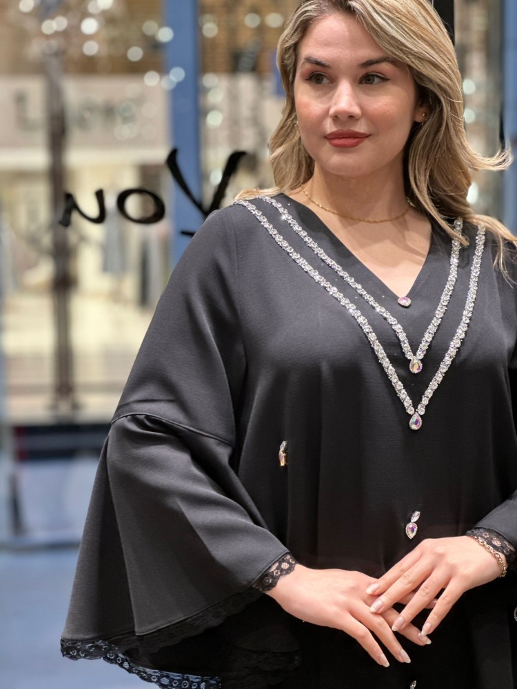 جلابيه اسود بقصة كم واسعه ب كرستال متفرق